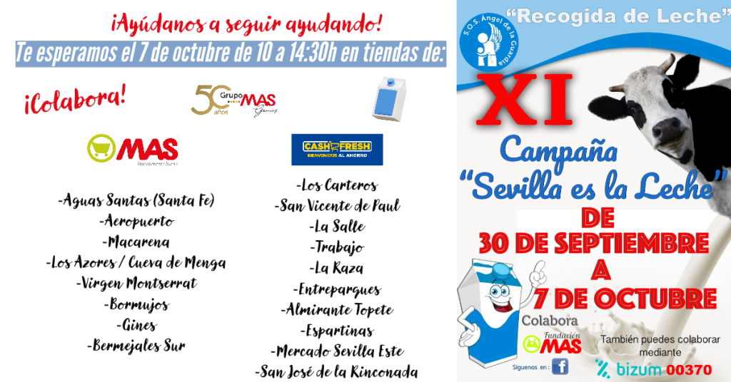 ¿Te gustaría aportar tu grano de arena? Te invitamos a colaborar en la 2º jornada de la XI Campaña de recogida de envases de leche «Sevilla es la leche» impulsada por la entidad colaboradora de Fundación MAS: S.O.S. Ángel de la Guardia.