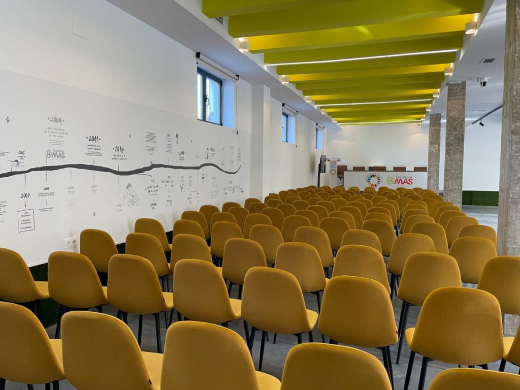 Con capacidad para 120 personas, permite organizar eventos y ponencias para los colaboradores del Centro ODS. Además comparte espacio con la Sala de Exposiciones por lo que ofrece la posibilidad de aumentar su aforo.